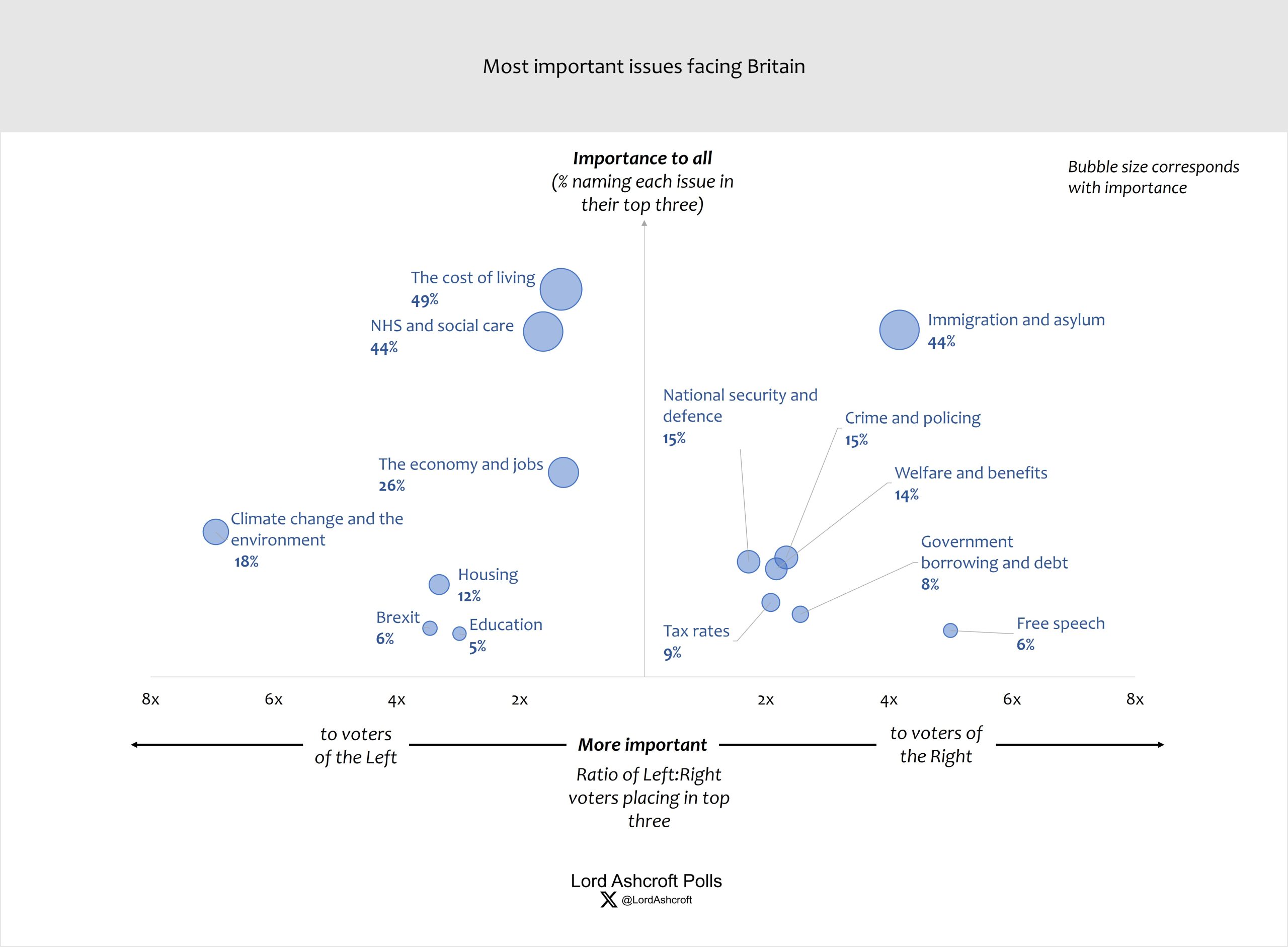 The cost of living is seen as the biggest issue facing the country, named in the top 3 by just under half of all voters. Joint second were the NHS and social care, tied with immigration and asylum – though there were sharp differences between Labour and Lib Dem voters and Conservative and Reform voters.