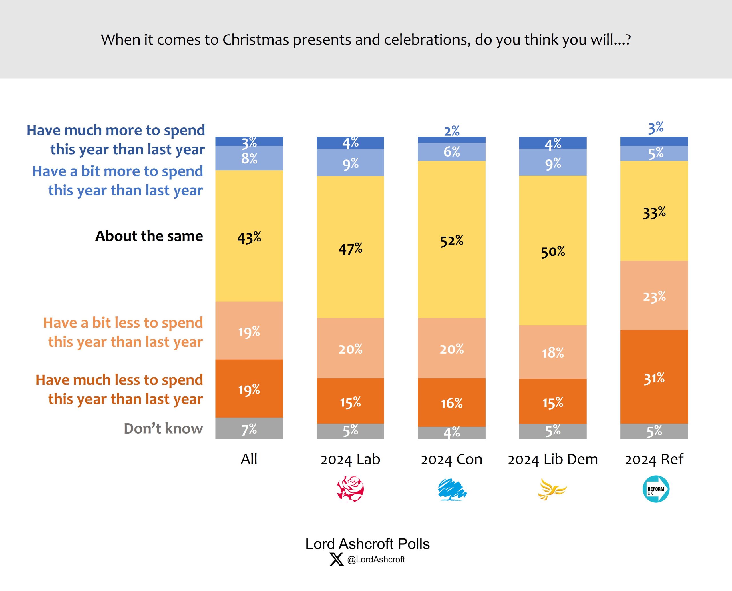 Voters as a whole were more than three times as likely to say they would have less to spend on Christmas than they did last year than that they would have more. Just under half said they would have about the same. Looked at another way, 54 per cent said they would have the same or more; 81 per cent said they would have the same or less.
