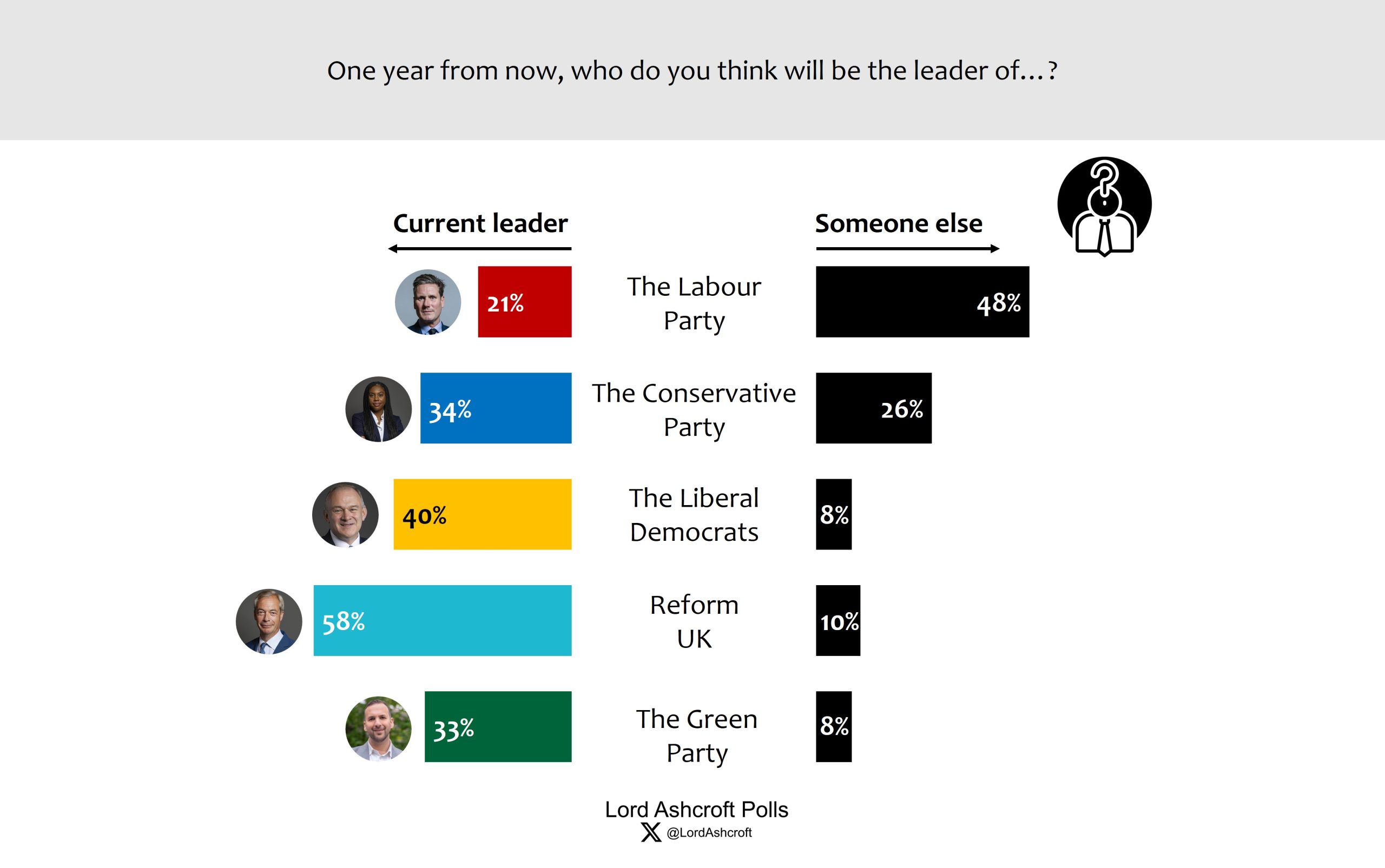 The proportion thinking Kemi Badenoch will still be in her job in a year’s time is up ten points since we last asked the question in October, to 34 per cent. The number saying the same for Starmer is down five points to 21 per cent (including only just over one third of 2024 Labour voters), and the proportion expecting Farage still to be leading Reform is down seven points to 58 per cent. While only one third say they expect Zack Polanski still to be leading the Greens, more than half say they don’t know enough to form an opinion.