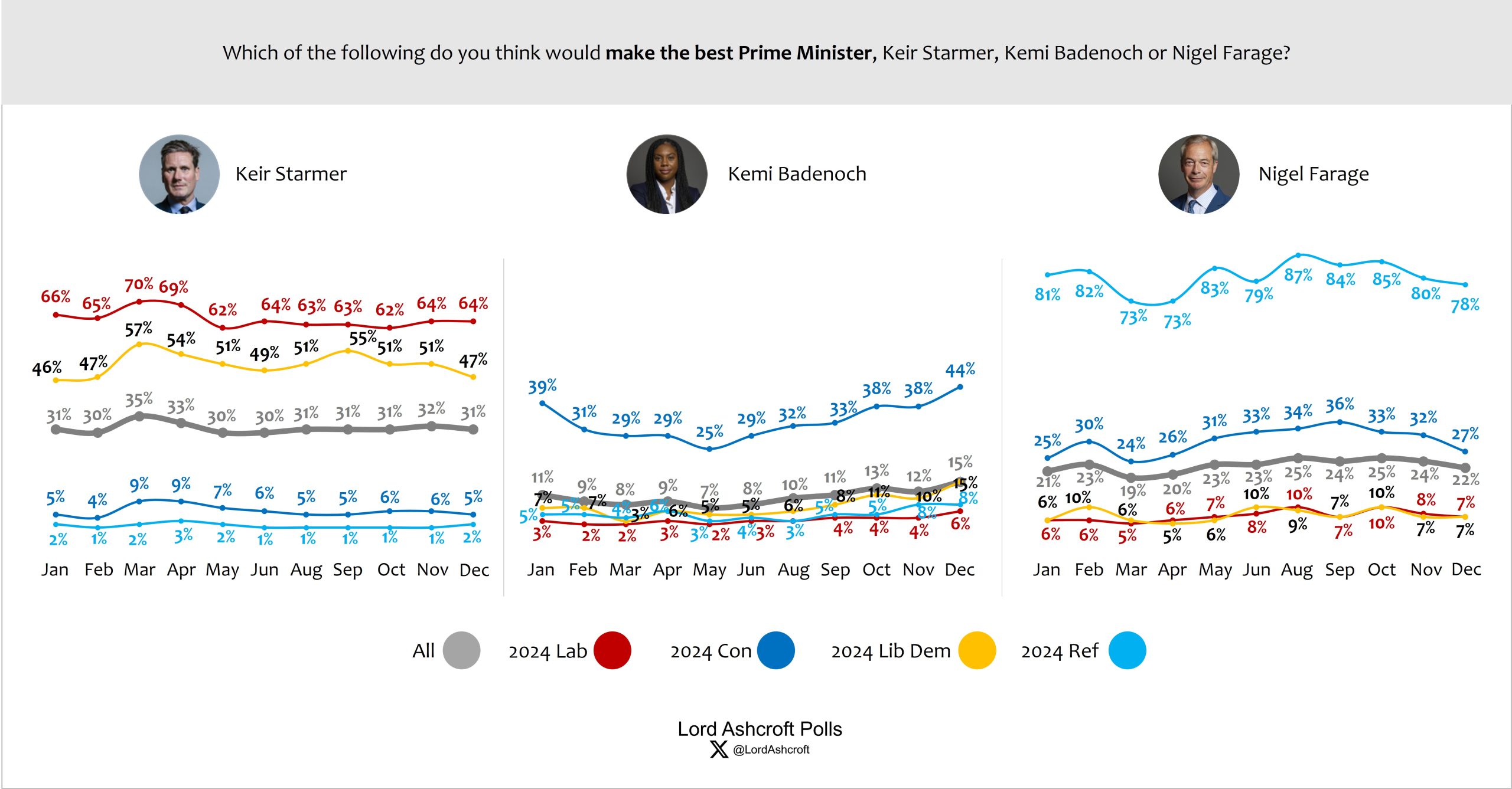 In a deceptively festive but in fact strategically critical question, we found that Keir Starmer was thought the leader most likely to make a boring speech at a Christmas party, sneak off from a Christmas get-together to do some work, and watch the King’s Christmas broadcast live at 3pm on Christmas Day.