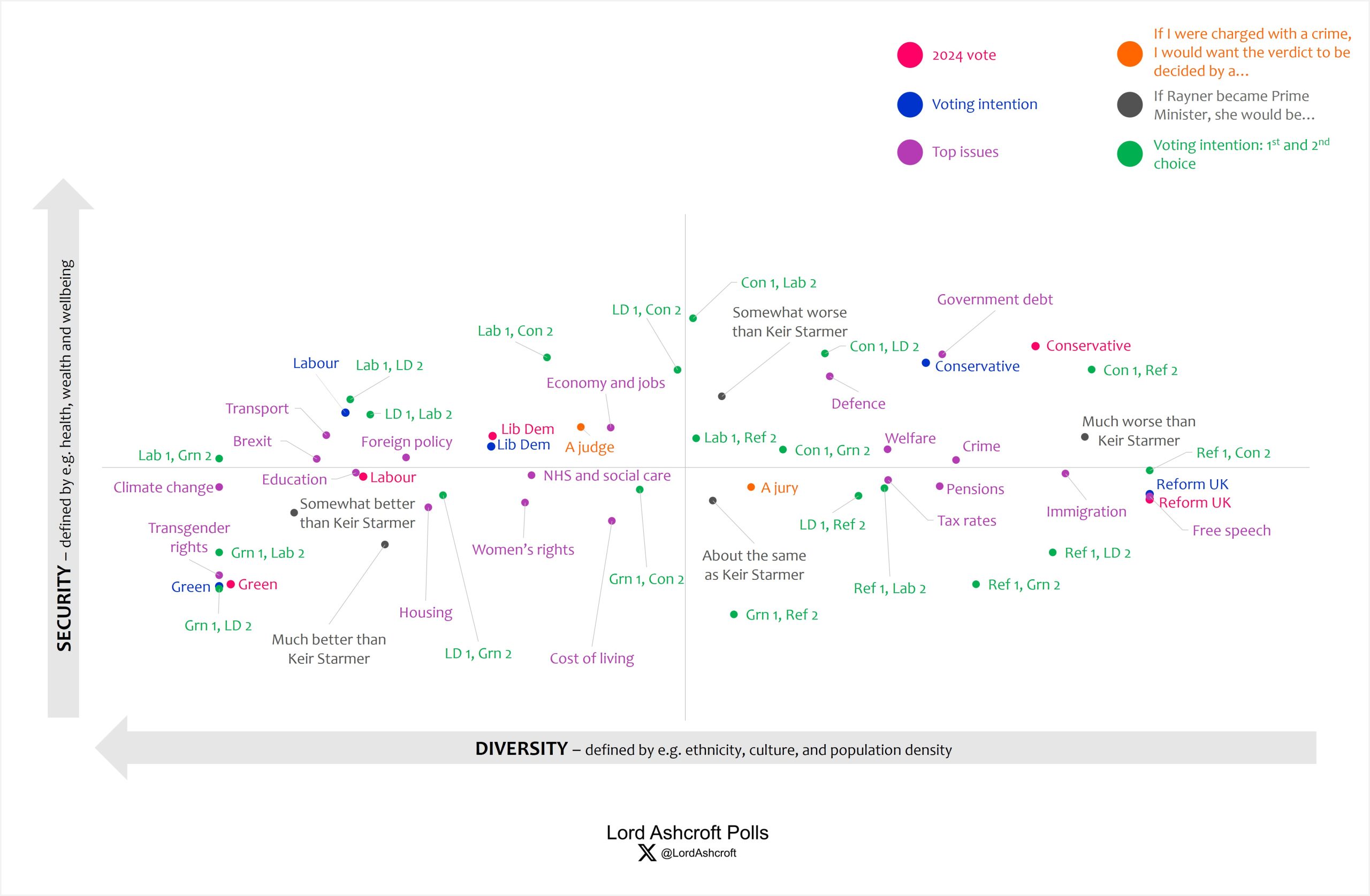 As above, our political map shows how different issues, attributes, personalities and opinions interact with one another. Each point shows where we are most likely to find people with that characteristic or opinion; the closer the plot points are to each other the more closely related they are. Here we can see the different policy priorities of different kinds of voters, their attitudes to jury trials and the potential return of Angela Rayner, and the distribution of voters who put different combinations of parties as their first and second choice.