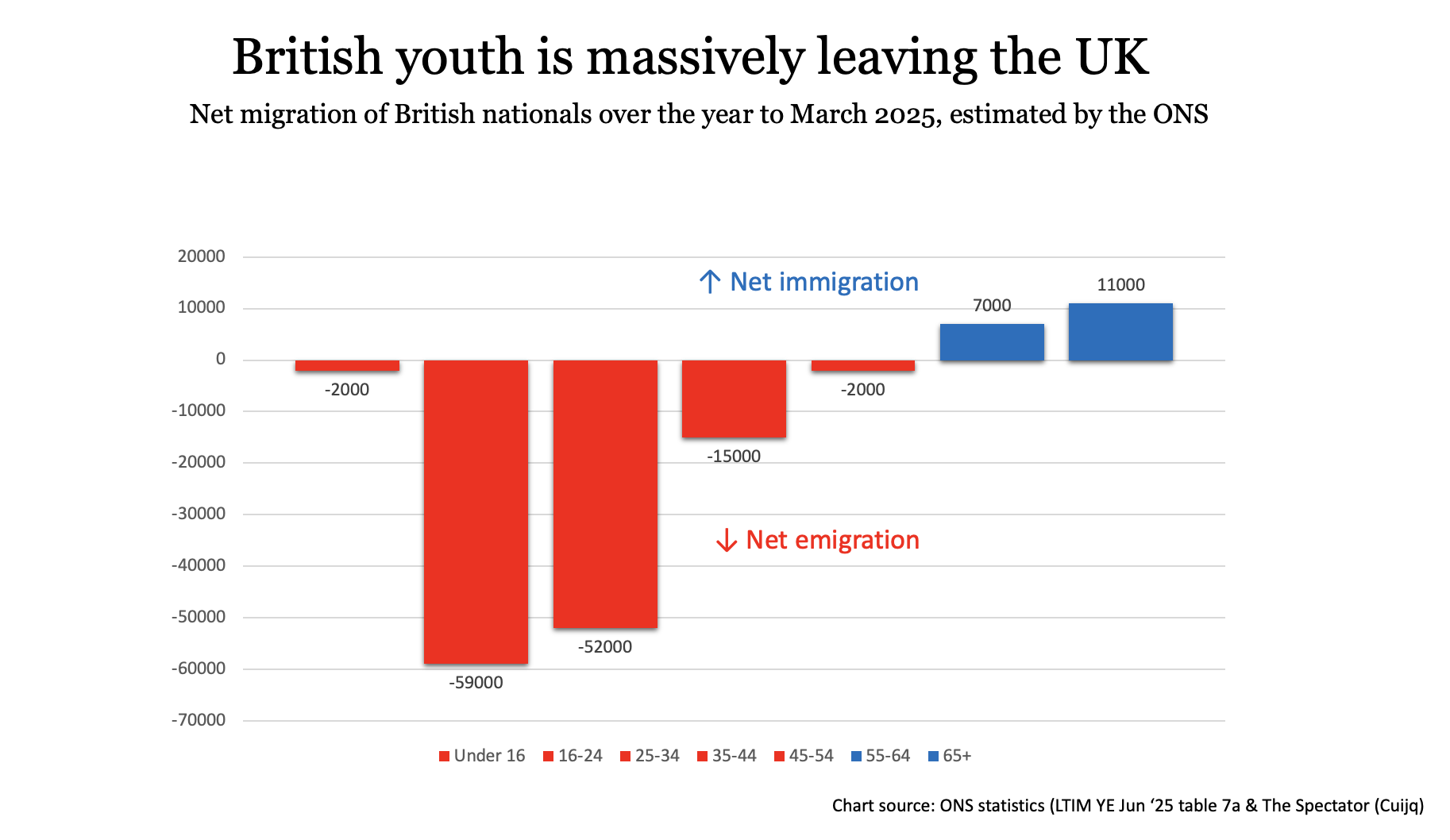 It is true that 143,000 British nationals returned to the UK, but the net migration is hugely negative. The net emigration (allowing for immigration too) for the 16-24 age group is 59,000 people and for the 25-34 age group it is 52,000. The only age groups where more Britons are returning to the UK than are leaving are the older ones, namely above 55 year olds, especially among 65+ year olds.