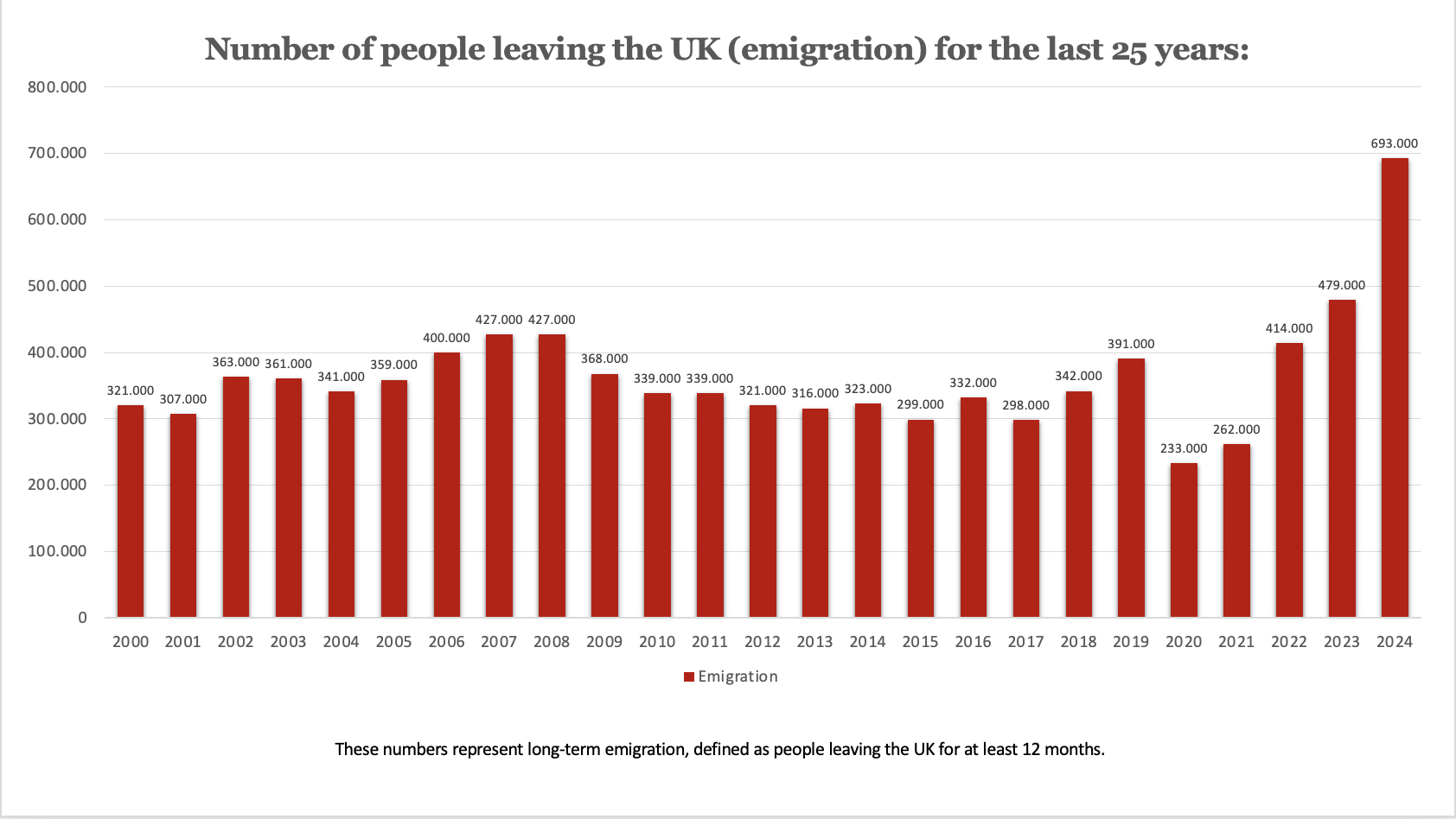 Among the 693,000 people that left the UK over the past year, it is particularly worrying that 257,000 are British nationals. The previous ONS (Office for National Statistics) estimate for Britons expected to leave in a year stood at 77,000, meaning that the current emigration of British nationals is three times higher than predicted.