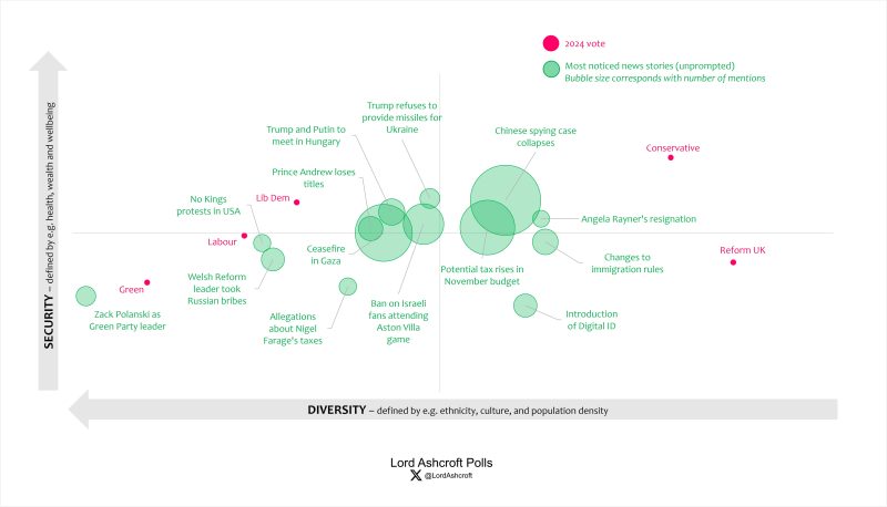 Our political map shows what kind of voters were most likely to recall which news. Stories about Gaza, Israeli football fans, Budget tax rises and the China spying case all appear close to the centre, meaning they were not confined to any particular corner of the electorate. Digital ID and immigration were most likely to be mentioned in the Reform-leaning bottom right quadrant, while news about Zack Polanski, Nigel Farage’s taxes and the No Kings protest in the US were most likely to have been clocked on the left-hand side of the map.