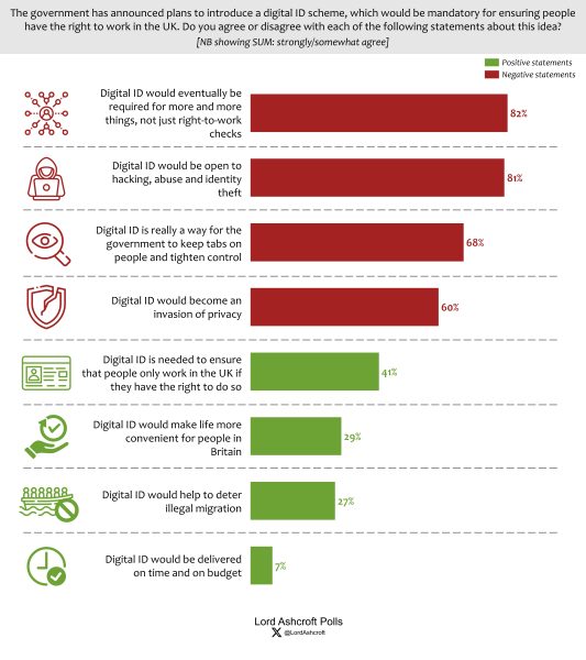 However, large majorities believed digital ID would become an invasion of privacy, that its real purpose was to allow the government to keep tabs on people and tighten control, that it would be open to hacking, abuse and identity theft, and that it would eventually be required for more and more things, not just right-to-work checks. Clear majorities of 2024 Labour voters agreed with the last three of these statements.