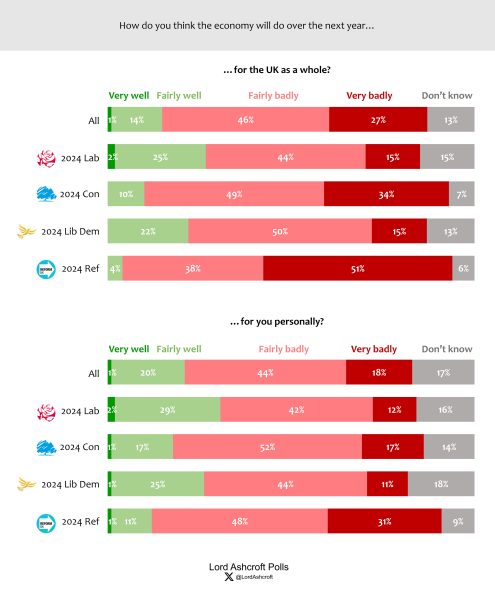 Voters as a whole thought the economy would do badly over the next year for the country as a whole by a 58-point margin. Those who voted Labour in 2024 thought this by a 32-point margin. People also thought the economy would do badly for them personally, though by a slightly lower 41-point margin. More than half of 2024 Labour voters expected things to go badly for them.