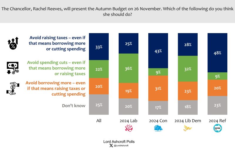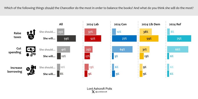 Fewer than a quarter of voters thought Rachel Reeves should raise taxes to balance the books, but more than half thought she would do so. Just over 4 in 10 thought she should cut spending, but only 12 per cent thought she would. More than half of 2024 Labour voters thought Reeves would raise taxes, compared to 37 per cent who thought she should do so.