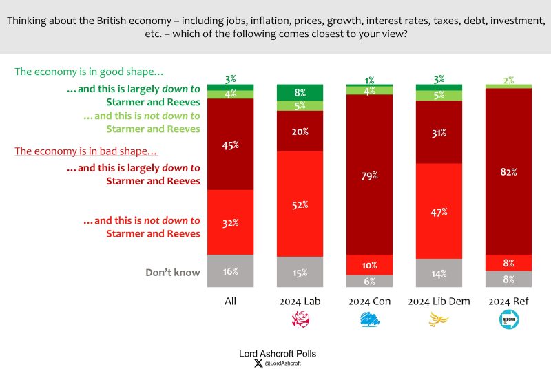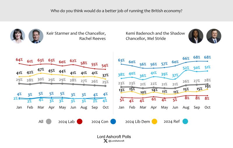 Asked who would do the better job running the economy, voters chose Kemi Badenoch and Mel Stride over Keir Starmer and Rachel Reeves by a 3-point margin with nearly half saying “don’t know”. Just over half of 2024 Labour voters named the Labour team; more than two thirds of 2024 Conservatives chose the Tory team.