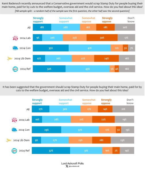 Overall, just under half of all voters said they supported the idea of scrapping Stamp Duty whether or not they knew it had been proposed by the Conservatives. However, 2024 Conservative voters were considerably more likely to back the plan when the party was named than when it wasn’t, while Labour voters were more likely to back it when the Tories were not mentioned than when they were not. Nearly three quarters of those who switched away from the Conservatives in 2024 said they supported the idea when told it had come from the Tories.