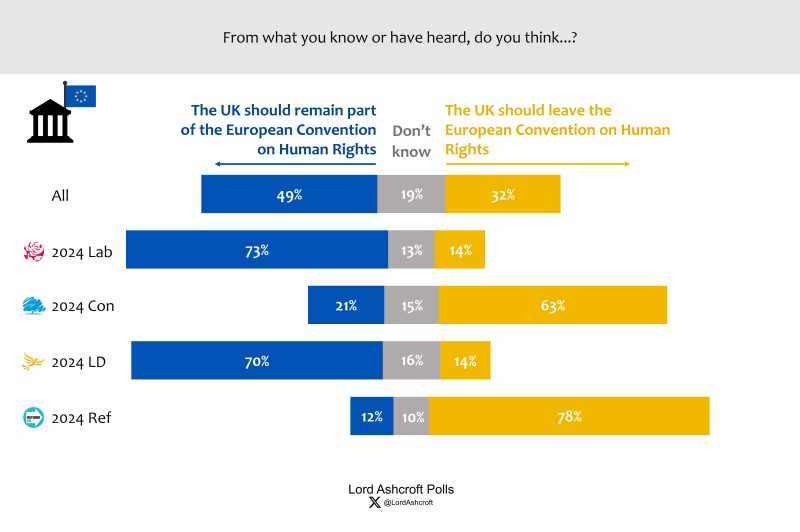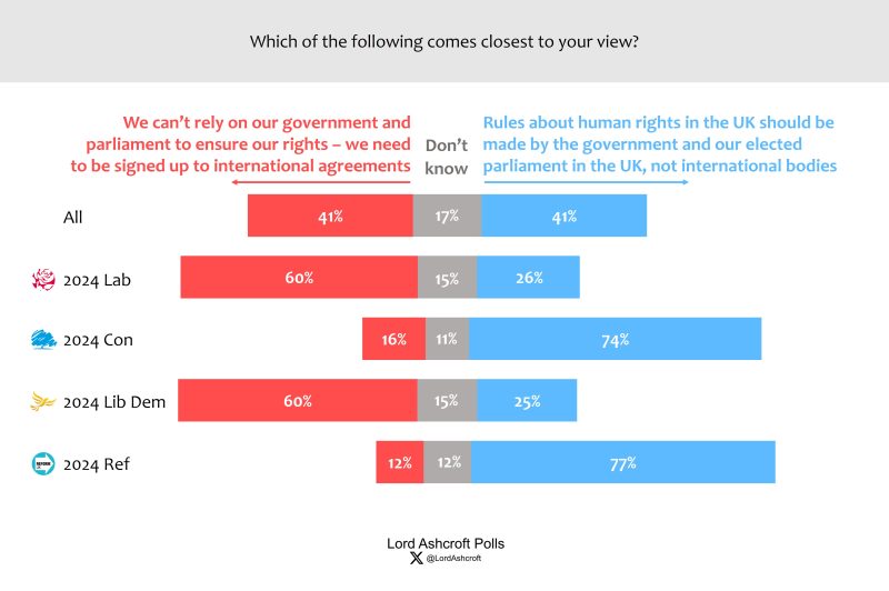 Voters overall thought the UK should remain part of the ECHR by a 17-point margin, with 2024 Labour voters wanting to do so by 73 to 14 per cent. However, 2024 Conservatives wanted to leave by a 42-point margin and Reform voters by 66 points.