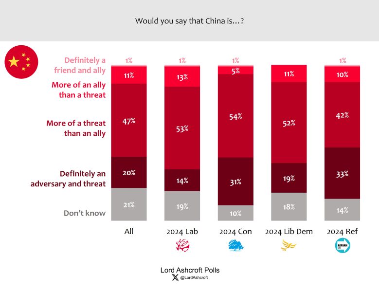 More than two thirds of voters said they thought China was more of a threat than an ally to the UK, including 1 in 5 who thought the country was definitely an adversary and a threat. Large majorities of 2024 Tories and Reform UK voters saw China as more of a threat than an ally, as did Labour voters and those who voted Lib Dem. One in five Green voters saw China as more of an ally than a threat, making them the most likely to do so.
