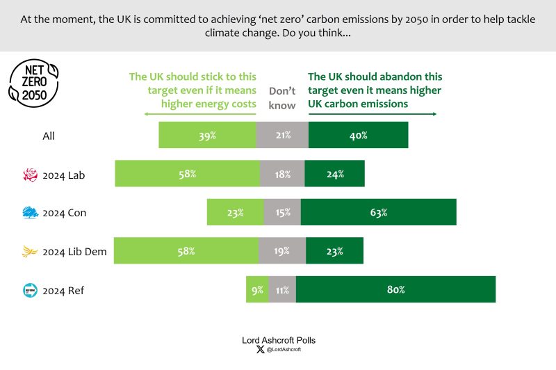 Voters were quite evenly divided between wanting to stick to the net zero target even if this meant higher energy costs and abandoning net zero even if it meant higher UK carbon emissions. 2024 Labour and Lib Dem voters wanted to keep the target (by 34 and 35 points respectively). Conservatives wanted to scrap net zero by a 40-point margin, and Reform voters by a 71-point margin.