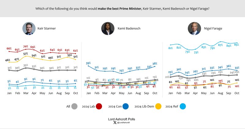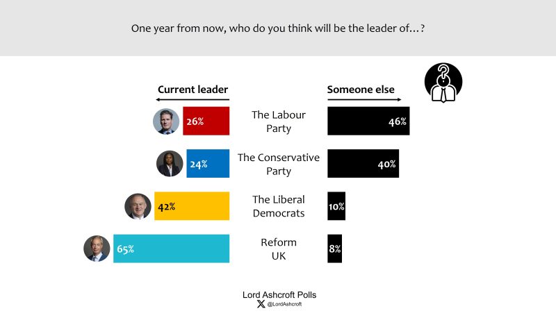 Only just over a quarter of all voters said they thought Keir Starmer would still be leader of the Labour Party in one year’s time, down from 35 per cent in August. The other leaders were all thought to be in a stronger position than two months ago: 24 per cent thought Kemi Badenoch would still be in her job (up 4 points), 42 per cent thought Ed Davey would be in his (up 5 points) and 65 per cent thought Farage would be in his (up 6 points).