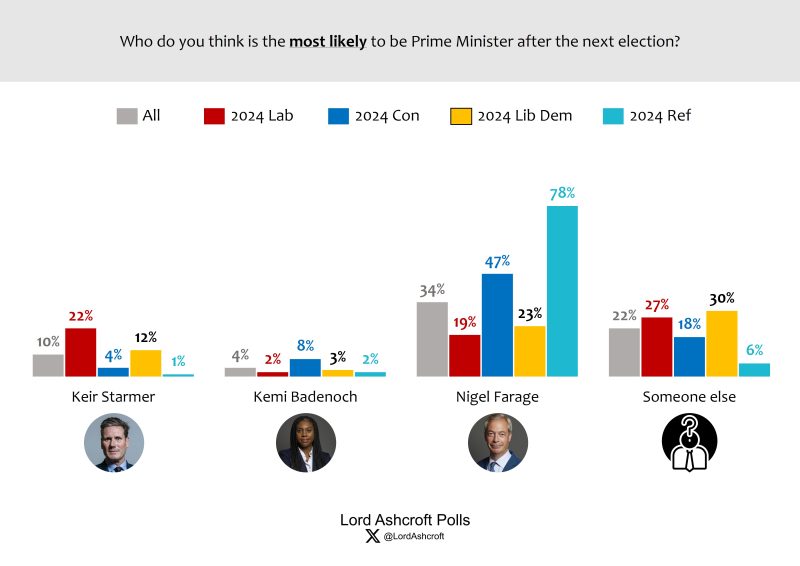 Nigel Farage was thought the most likely person to be PM after the next election, with just over one third naming him as the most likely candidate. Only 1 in 10 thought Starmer would still be in the job and 4 per cent named Badenoch. More than 1 in 5 thought someone else would be PM. 84 per cent of those currently intending to vote Reform thought Farage would be PM, compared to 38 per cent of Labour voters who thought Starmer would be PM and 14 per cent of current Conservative voters who thought Badenoch would have the job.