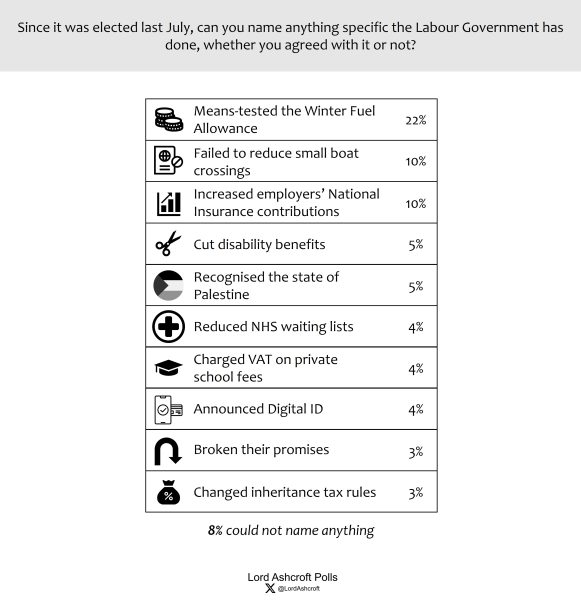 Cuts to the winter fuel allowance continue to top the table when we ask what the Labour government has done since it came to power in July 2024. Failing to stop small boat crossings and increasing employers’ National Insurance come joint second, followed by cutting (or attempting to cut) disability benefits – which tied with recognising a Palestinian state with 5 per cent of respondents mentioning it.