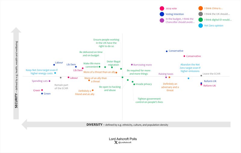As above, our political map shows how different issues, attributes, personalities and opinions interact with one another. Each point shows where we are most likely to find people with that characteristic or opinion; the closer the plot points are to each other the more closely related they are. Here we can see that those wanting to avoid tax rises and borrowing increases in the November Budget are most likely to be found on the right-hand side of the map, while those who prioritise avoiding spending cuts are most likely to be found in Labour and Green-leaning territory. We can also see that the minorities who agreed with positive statements about digital ID were all most likely to be found in the left-hand side of the map, while those believing it would eventually be required for more and more things besides right-to-work checks appeared exactly in the centre, meaning it gained wide agreement throughout the electorate.