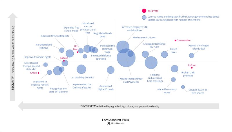 Our political map shows that winter fuel and employers’ NI were fairly universally recalled. Small boats, tax increases and the Chagos Islands deal were most likely to be mentioned in the Conservative- and Reform-leaning top and bottom right, while benefit cuts, recognition of a Palestinian state, renters’ and workers’ rights, free school meals and President Trump’s second state visit were most likely to be recalled in Labour, Lib Dem and Green territory on the left-hand side of the map.