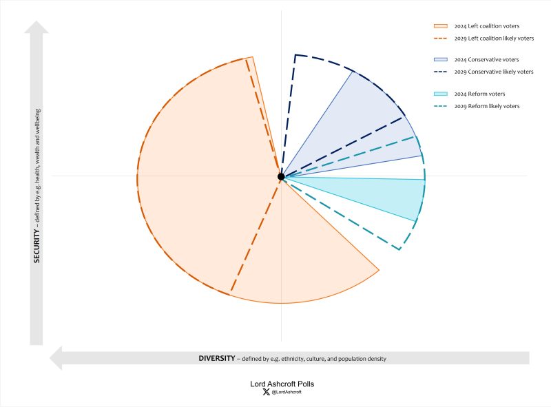 We can see that in 2024 the left coalition, comprising Labour, the Lib Dems, the SNP and Plaid Cymru, covered most of the top left quadrant, the whole of the bottom left and nearly half of the bottom right. It has now shrunk significantly no longer commands a plurality in any part of the less prosperous, less diverse bottom right. Meanwhile, the slice dominated by Reform UK has expanded into the more secure top right quadrant, with the Conservatives pushed further into that quadrant and further from the Brexit-backing bottom right which formed a crucial part of their 2019 majority.