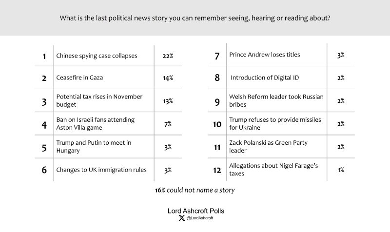 The collapse of the China spying case was the most-recalled recent political news story, ahead of the Gaza ceasefire, speculation about Budget tax rises, and the decision to ban visiting Israeli football fans from attending their game with Aston Villa.