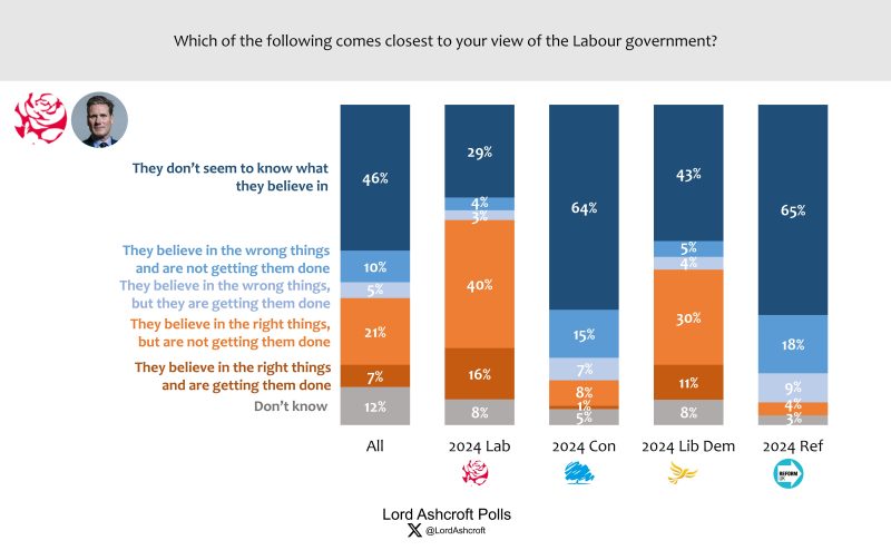 Only 7 per cent of voters overall (including only around one in six 2024 Labour voters) said they thought the current Labour government believed in the right things and was getting them done. A further one in five (including 40 per cent of 2024 Labour voters) thought the government believed in the rights things but were not getting them done. Nearly half of all voters, including nearly three in ten 2024 Labour voters, said the government did not seem to know what it believed in.