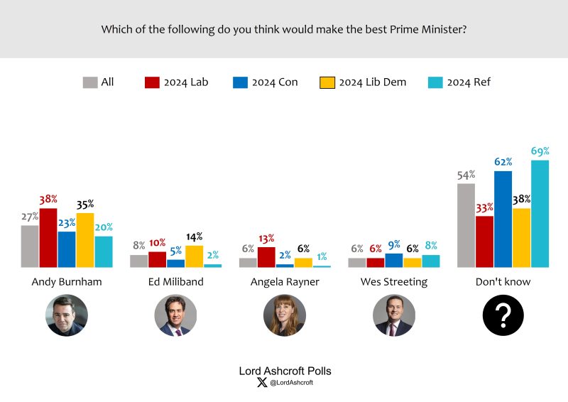 Among those spoken of as potential future Labour leadership contenders, Andy Burnham was comfortably ahead both among voters as a whole and among current and 2024 Labour voters. While there was little to choose between Rayner, Streeting and Miliband in the country as a whole, Labour supporters put Rayner in second place, with Streeting a distant fourth.