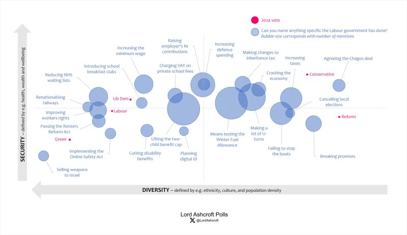Our political map shows what kind of voters have noticed which government actions. Means testing the winter fuel allowance and lifting the two-child benefit cap both appear close to the centre of the map, showing they were recalled across the electorate rather than by any particular group. The Chagos Islands deal, U-turns and tax rises were most likely to be mentioned by those on Conservative and Reform-supporting side of the map, while the minimum wage, NHS waiting lists, rail renationalisation, workers’ rights and school breakfast clubs were more likely to be recalled in Labour, Lib Dem and Green territory.