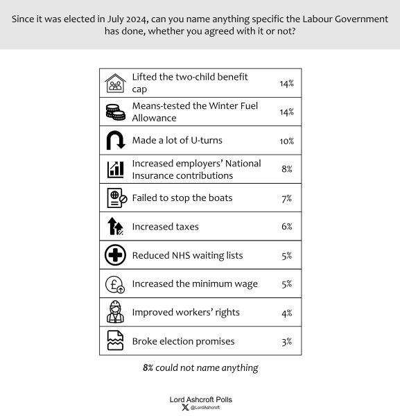 When we asked people to name without prompting what they remembered that the Labour government had done since being elected, the two most common answers were lifting the two-child benefit cap and means testing the winter fuel allowance. U-turns and raising employers’ National Insurance were next on the list.