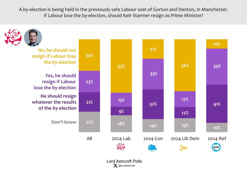 Nearly a quarter of voters said Keir Starmer should resign if Labour lose the Gorton & Denton by-election, while just over one third said he should not. However, a further 21 per cent said he should resign whatever the result of the by-election.