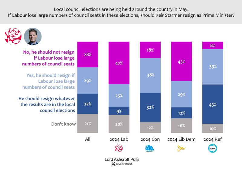 Slightly more said Starmer should resign if Labour badly in the council elections in May, with 28 per cent saying he should not. Again, just over one in five said he should resign whatever the local election results.