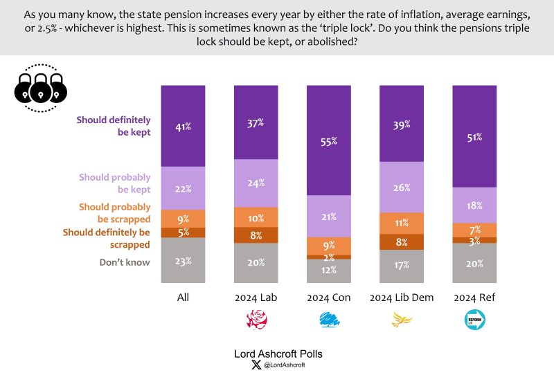 More than six in ten voters, including majorities of all parties’ supporters, said the pension triple lock should be kept. Nearly 90 per cent of those aged sixty-five or over said it should be kept, compared to four in ten of those aged 18-24.