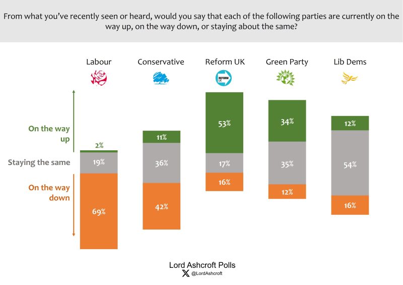 Reform UK were the party most likely to be considered “on the way up”, followed by the Greens. Nearly seven in ten said they thought Labour were on their way down, including a majority of those who voted Labour in 2024.