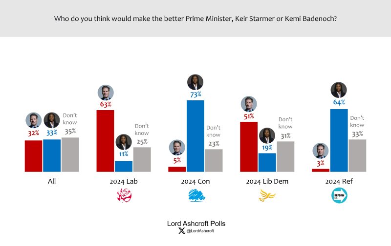 In a head-to-head question, Badenoch led Starmer by one point with just over one third saying “don’t know”. Just over six in ten 2024 Labour voters say Starmer would make the better PM, while nearly three quarters of 2024 Conservatives named Badenoch. Those who voted Reform UK in 2024 said they preferred Badenoch to Starmer by a 61-point margin, with one in three saying “don’t know”.