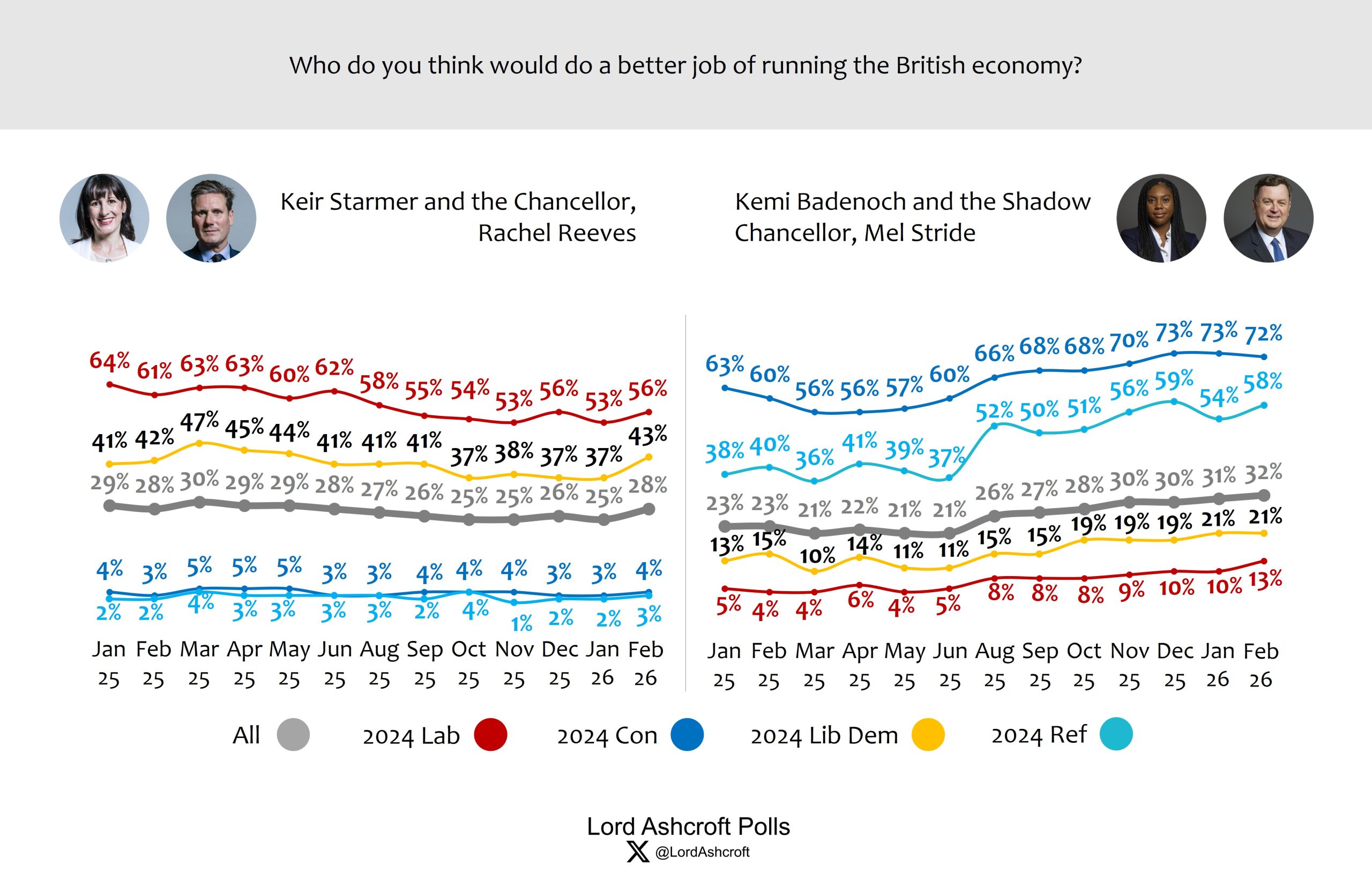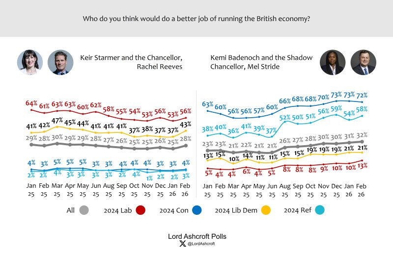 Asked who would do the better job running the economy, voters chose Kemi Badenoch and Mel Stride over Keir Starmer and Rachel Reeves by a 4-point margin, with 40 per cent saying, “don’t know”. Only just over half of 2024 Labour voters named the Labour team; more than seven in ten 2024 Conservatives chose the Tory team.