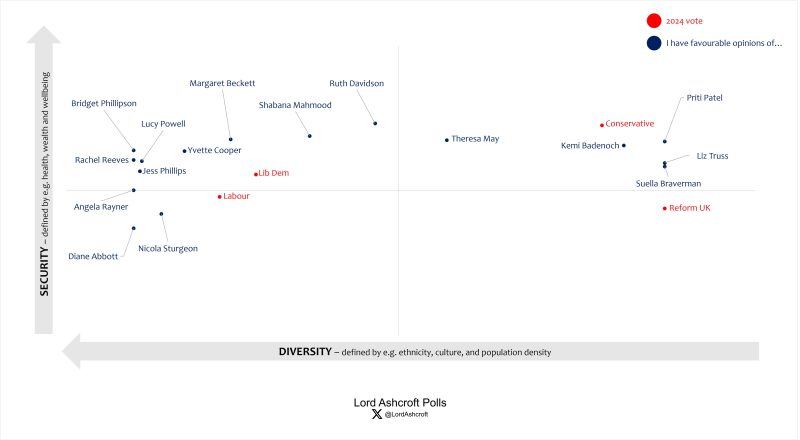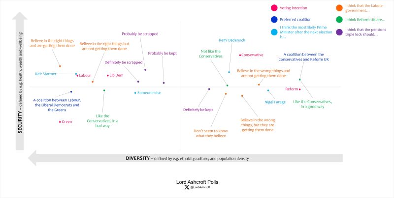 As above, our political map shows how different issues, attributes, personalities and opinions interact with one another. Each point shows where we are most likely to find people with that characteristic or opinion; the closer the plot points are to each other the more closely related they are. Here we see the distribution of opinion on the Labour government, the pensions triple lock, most likely prime minister and whether or not Reform are like the Conservatives.