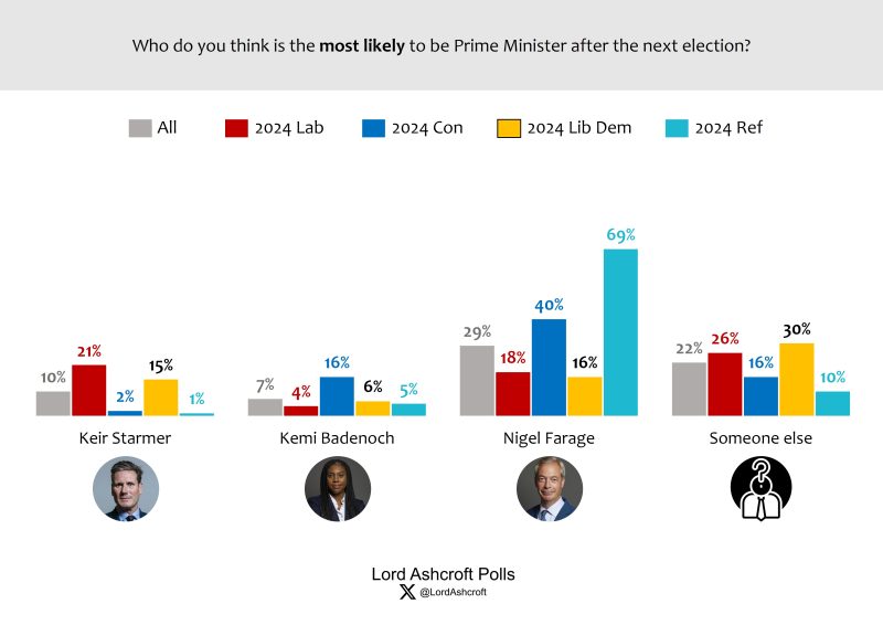 Nigel Farage was thought the most likely person to be PM after the next election, with 29 per cent naming him as the most likely candidate. Only one in ten thought Starmer would still be in the job and 7 per cent named Badenoch. More than one fifth thought someone other than these three would be PM. More than eight in ten of those currently intending to vote Reform thought Farage would be PM, compared to fewer than four in ten current Labour leaners who thought Starmer would be PM and just over a quarter of current Conservative supporters who thought Badenoch would have the job.
