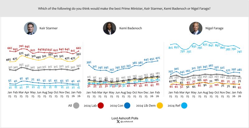 Offered a choice between Starmer, Badenoch and Farage, voters chose Starmer over Farage by a 12-point margin, with Badenoch in third place on 18 per cent. 2024 Conservative voters preferred Badenoch over Farage by a 19-point margin (up from 6 points in November), and 2024 Labour voters preferred Starmer over Badenoch by 58 points.