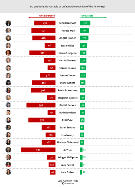 In advance of International Women’s Day, we asked how favourable people felt towards various current and recent living female politicians. Ranked in order of the proportion saying they had a favourable view, Kemi Badnoch topped the list, followed by Theresa May, Angela Rayner and Jess Phillips. Next were Nicola Sturgeon, Harriet Harman, Caroline Lucas and Yvette Cooper. Below, our political map shows how favourability towards these individuals is distributed across the population: