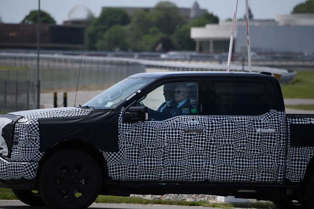 TOPSHOT – US President Joe Biden drives the new electric Ford F-150 Lightning at the Ford Dearborn Development Center in Dearborn, Michigan on May 18, 2021. (Photo by Nicholas Kamm / AFP) (Photo by NICHOLAS KAMM/AFP via Getty Images)