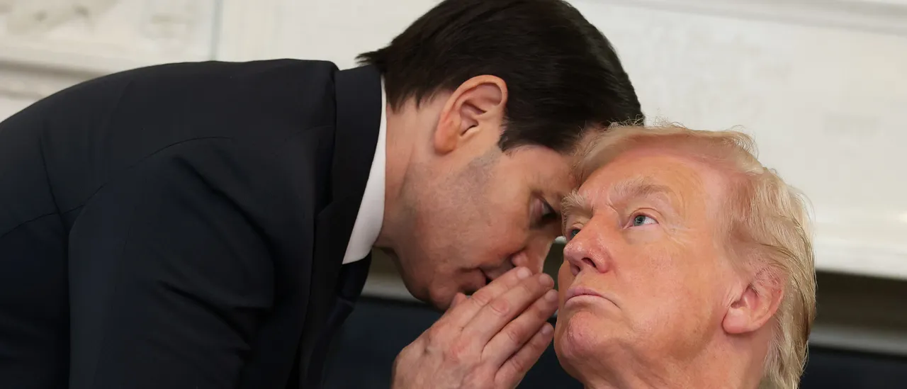 Secretary of State Marco Rubio was caught leaning towards President Donald Trump’s ear during a briefing at the White House on Wednesday and handed him a handwritten note with urgent instructions.