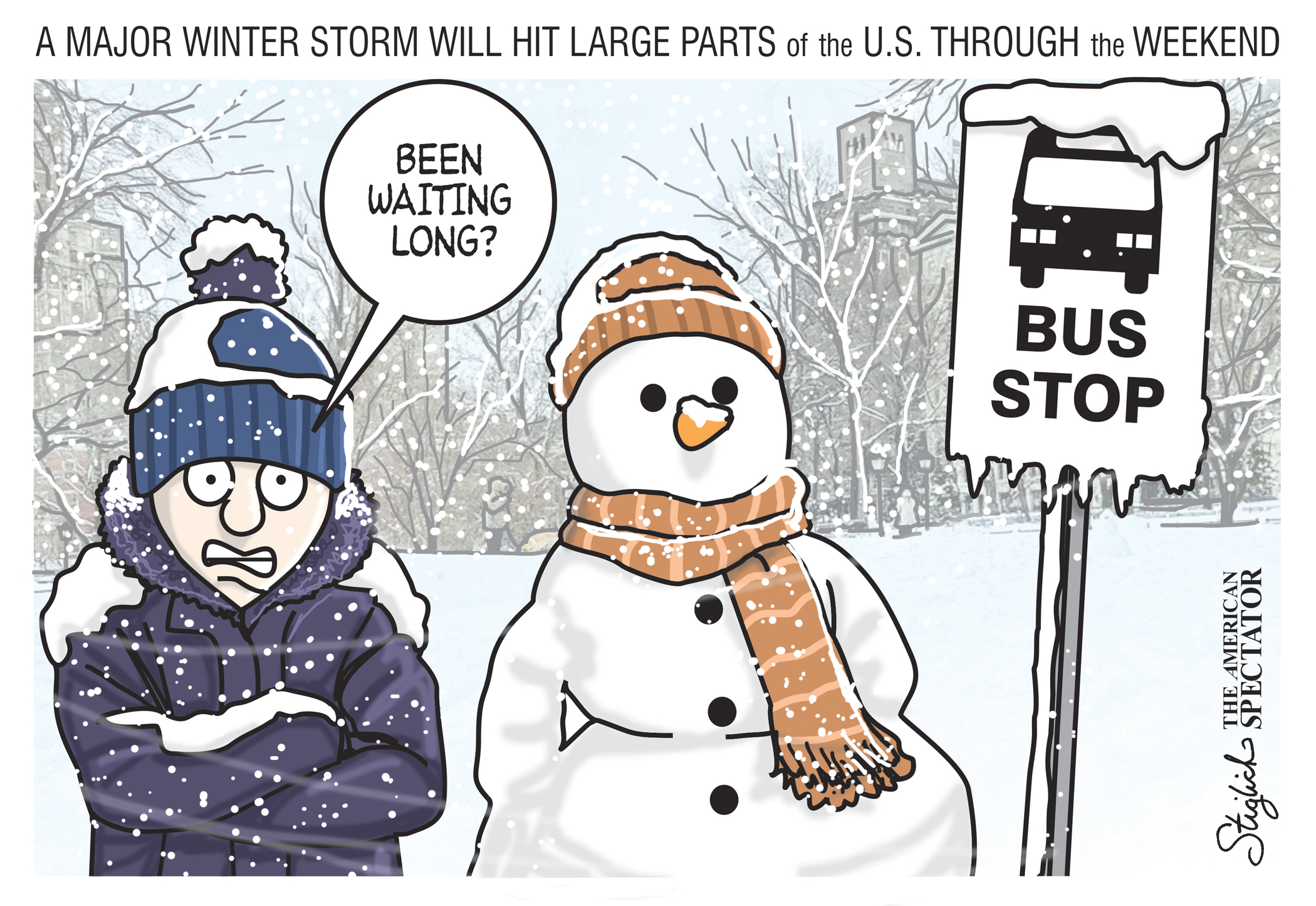 “Massive Snowstorm Coming,” editorial cartoon by Tom Stiglich for The American Spectator on Jan. 22, 2026.