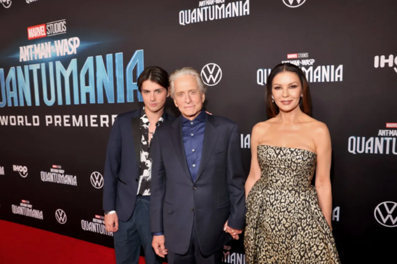 LOS ANGELES, CALIFORNIA – FEBRUARY 06: (L-R) Dylan Michael Douglas, Michael Douglas and Catherine Zeta-Jones attends the Ant-Man and The Wasp Quantumania world premiere at Regency Village Theatre in Westwood, California on February 06, 2023. (Photo by Jesse Grant/Getty Images for Disney)
