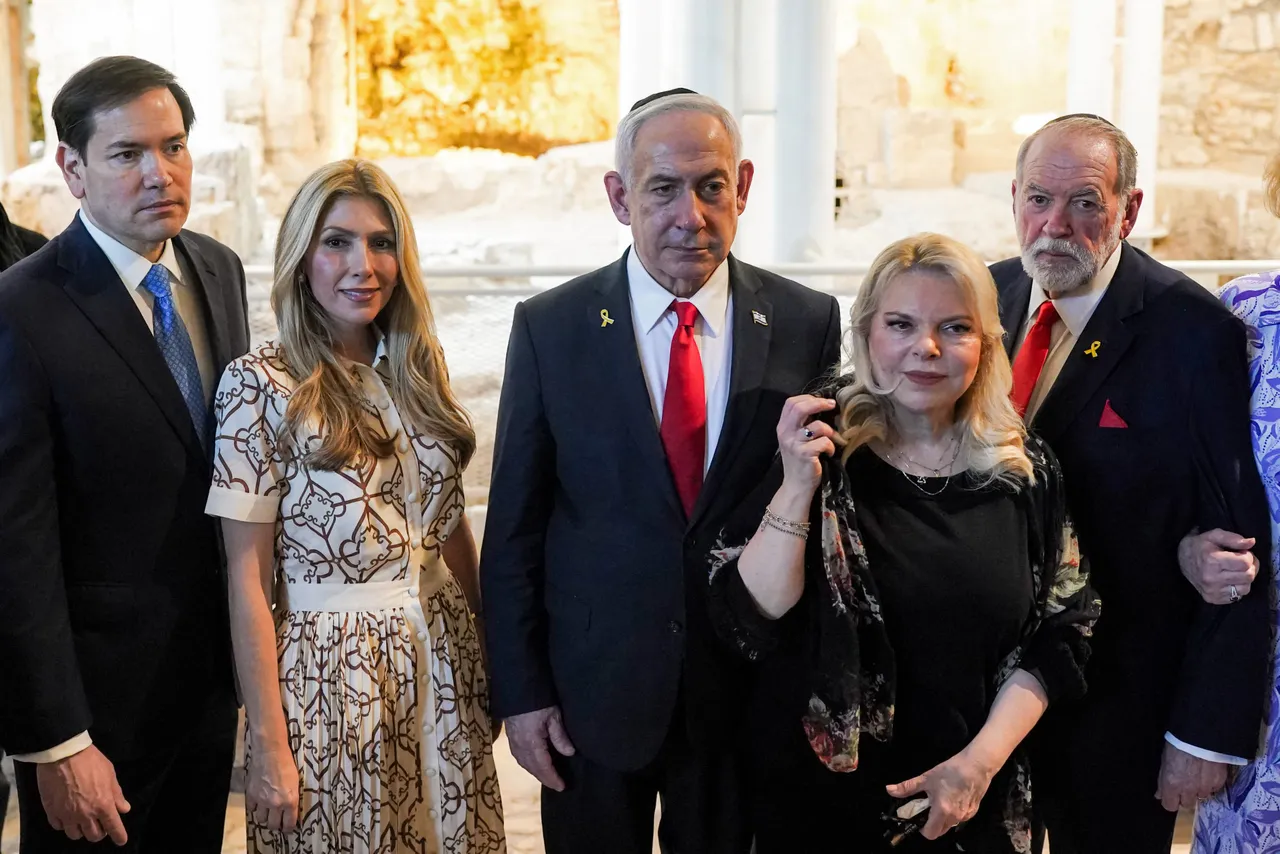 (L to R) US Secretary of State Marco Rubio, his wife Jeanette Dousdebes, Israel’s Prime Minister Benjamin Netanyahu, his wife Sara Netanyahu, US ambassador to Israel Mike Huckabee, and his wife (outside frame) pose for a group picture together during a visit to the Western Wall Tunnels, underneath the Jewish holy site, in the old city of Jerusalem on September 14, 2025. Top US diplomat Marco Rubio began a visit to Israel on September 14, after expressing the Trump administration’s unwavering support for its ally in the war with Hamas despite a strike in Qatar that drew broad criticism of Israel. (Photo by NATHAN HOWARD/POOL/AFP via Getty Images)