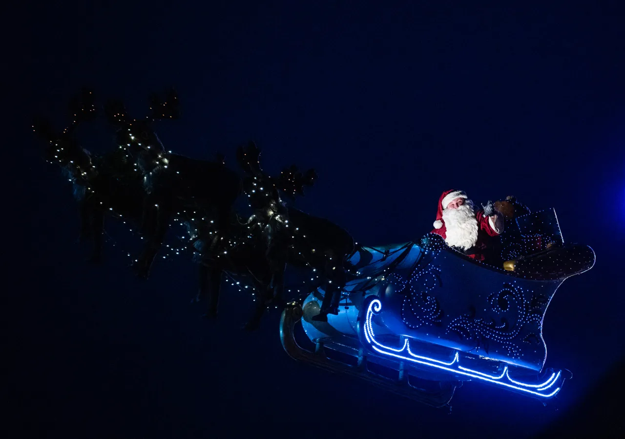 A performer dressed as Santa Claus greets visitors as he rides his sleigh with reindeers over a traditional Christmas market in Berlin, Germany, on December 8, 2025. (Photo by John MACDOUGALL / AFP via Getty Images)