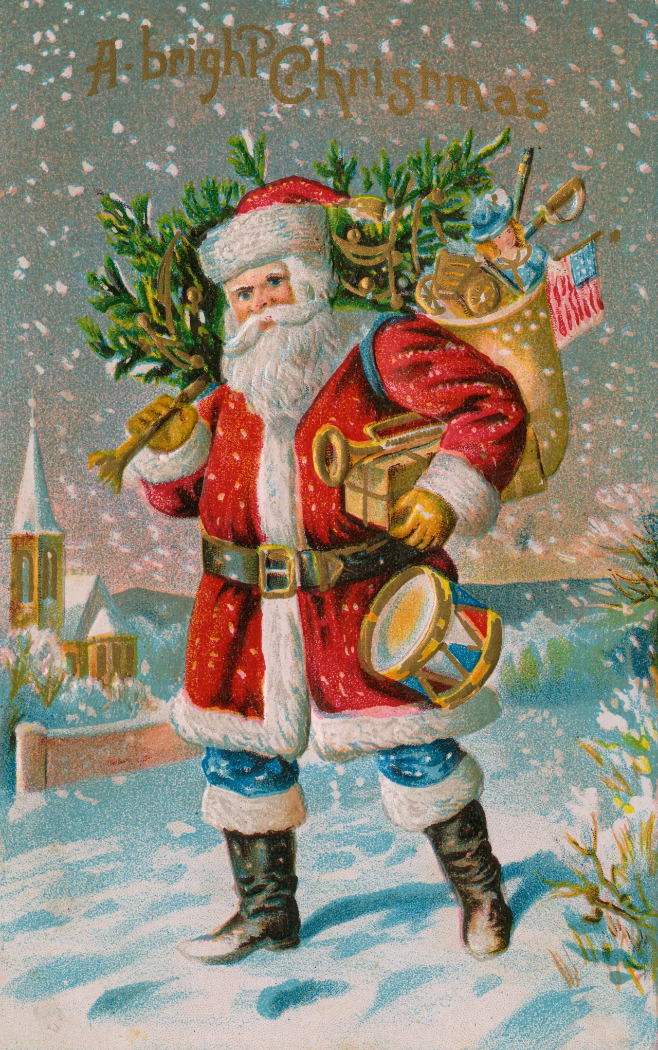 A Bright Christmas’ vintage illustration with Santa Claus carrying a Christmas tree and a bag of presents, 1907. (Illustration by GraphicaArtis/Getty Images)