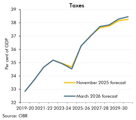 “Taxes are forecast to increase from 36% of GDP this year to 38% by the end of the forecast, with personal taxes accounting for half the increase. The projected 2030-31 level would be a historical high in the UK and almost 6% of GDP above the pre-pandemic level.”