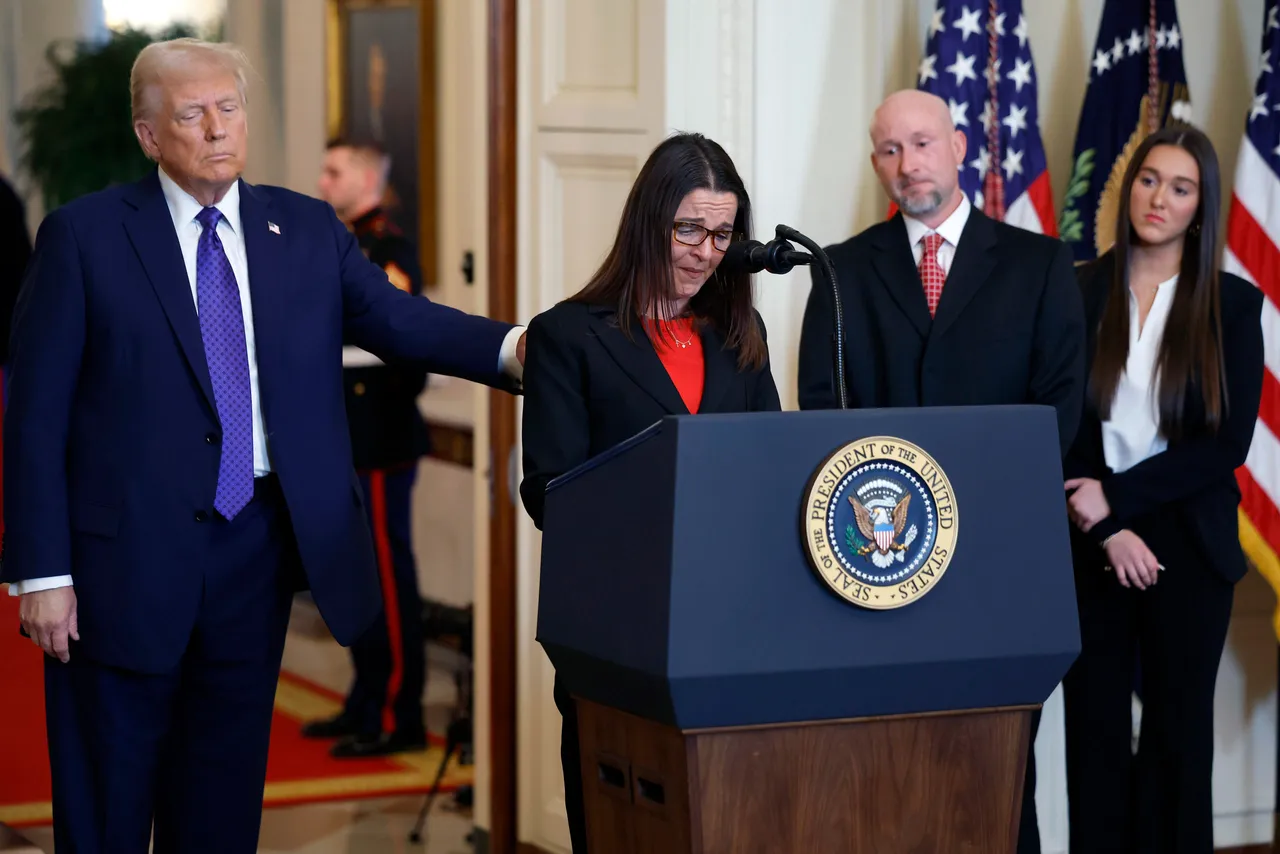 WASHINGTON, DC – JANUARY 29: Allyson Philips (C) is comforted by U.S. President Donald Trump as she talks about her daughter with her husband Jason Riley (3rd L) and their other daughter during the signing ceremony for the Laken Riley Act in the East Room of the White House on January 29, 2025 in Washington, DC. (Photo by Chip Somodevilla/Getty Images)
