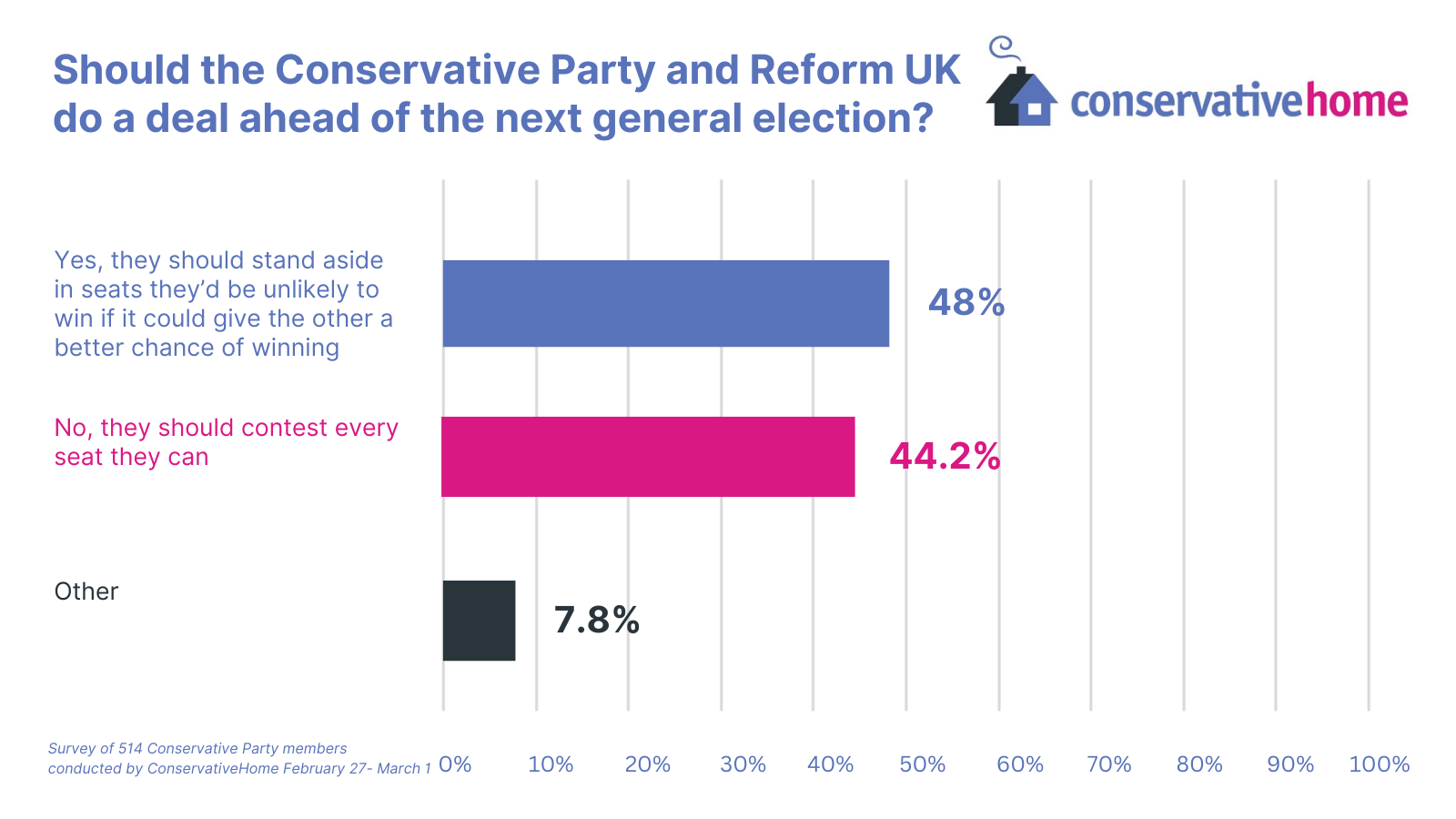 Despite all this, however, almost half of these very same members (48 per cent) believe a deal should be done between the Conservative Party and Reform UK in the run up to the next general election. They think that in seats either party has a better chance of winning, the other should stand aside.