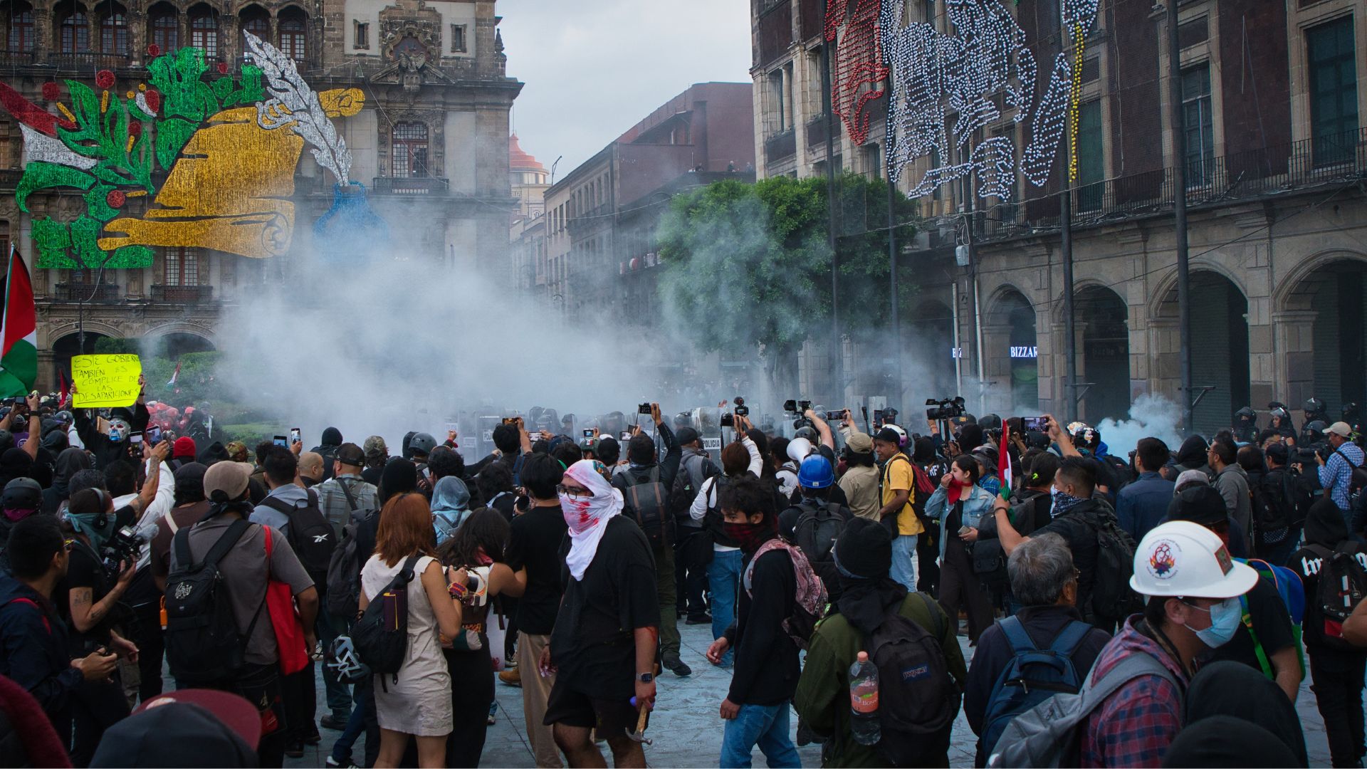 The anti-Sheinbaum crowd in Mexico City continues to attempt to tear down the security wall protecting the National Palace. Mexican police are deploying CS powder and flashbangs. pic.twitter.com/Nx8NEDaP55