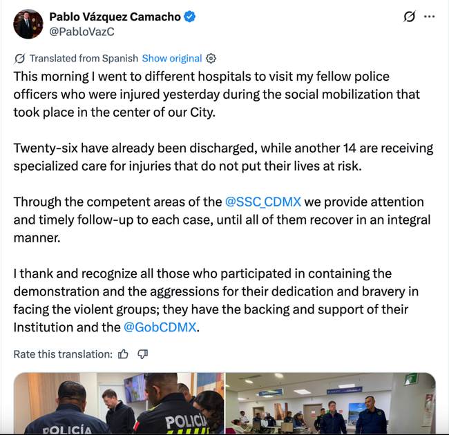 Pablo Vázquez, Secretary of Citizen Security of Mexico City, said that approximately 120 people were injured in total during the unrest, including about 100 police officers.