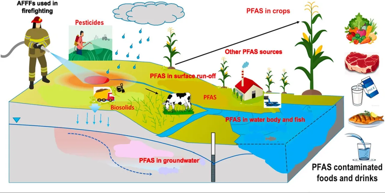 PFAS exposure does not come from just one source. Research shows that these chemicals can move through the food system as well as water, which is why PFAS exposure is now understood as a multi-pathway issue. Because PFAS are highly persistent in the environment, they can travel through agriculture, aquatic ecosystems, and food packaging before reaching people.